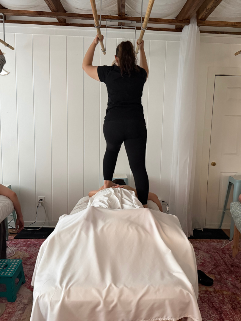 With the use of overhead bars for support and control, our Ashiatsu massage allows the therapist to apply deep, broad pressure using their feet. This technique delivers a slow, consistent compression that helps release stubborn tension, improve circulation, and provide deep relief without the sharp pressure that can sometimes occur with traditional deep tissue work. Ashiatsu is especially beneficial for those who enjoy deeper pressure and want a relaxing yet effective therapeutic experience.